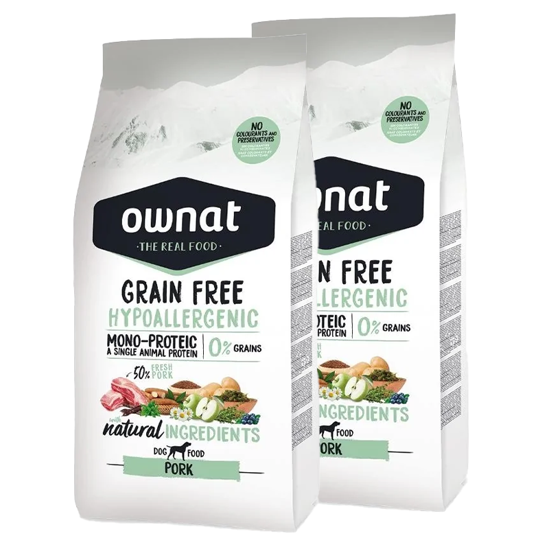 Ownat Grain Free Hypoallergenic es una elección de alta calidad elaborada sin cereales y utilizando cerdo como única fuente de proteína animal. Esto lo convierte en una excelente opción para perros con alergias o sensibilidades alimentarias. Contiene un generoso 70% de cerdo fresco, que proporciona proteínas de alto valor biológico, un sabor irresistible y una mayor absorción de nutrientes.