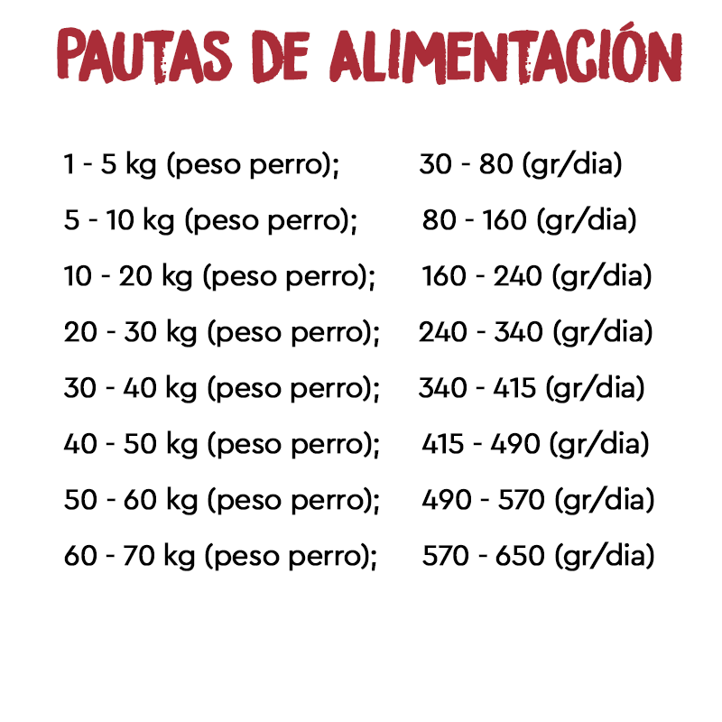 Vitamina A 22.000 UI, vitamina D3 1.500 UI, vitamina E 400 UI, vitamina C 100 mg, taurina 1.500 mg, L-carnitina 200 mg, cobre (sulfato de cobre (II) pentahidratado) 5 mg, cobre (quelato de cobre (II) de aminoácidos hidratado) 5 mg, manganeso (óxido de manganeso (II)) 50 mg, zinc (óxido de zinc) 100 mg, hierro (sulfato de hierro (II) monohidratado) 50 mg, zinc (quelato de zinc de aminoácidos hidratado) 10 mg, yodo (yoduro de potasio) 4 mg, selenio (selenito sódico) 0,3 mg, kcal/kg 4.225. Con antioxidantes naturales.