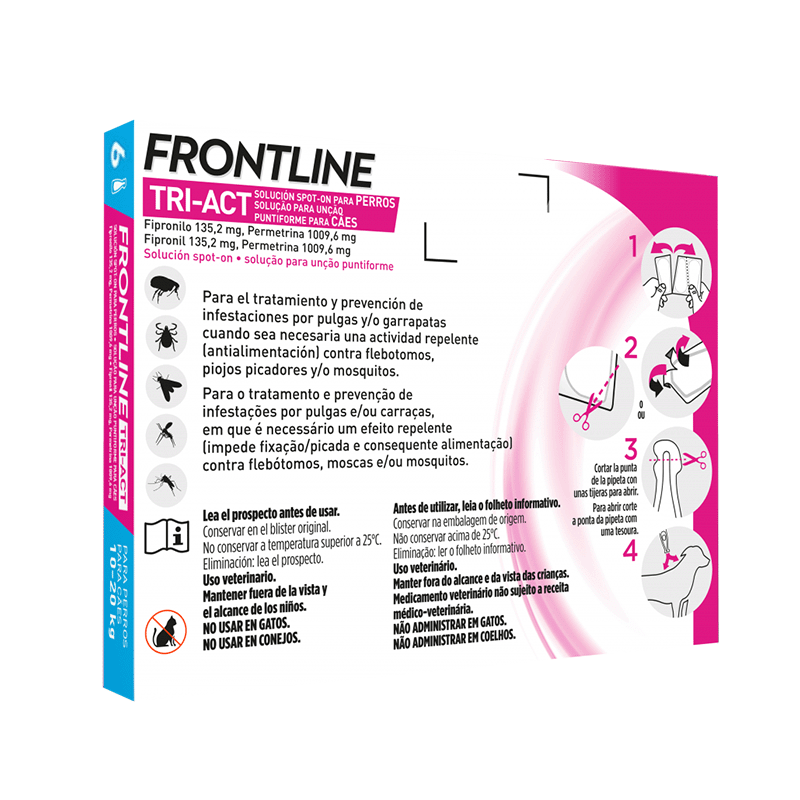La fórmula resistente al agua asegura que el producto siga siendo efectivo incluso si tu perro se moja, y se recomienda esperar 48 horas antes del baño. Apto para cachorros a partir de las 8 semanas de edad y con un peso mínimo de 2 kg. No se debe usar en gatos ni conejos.
