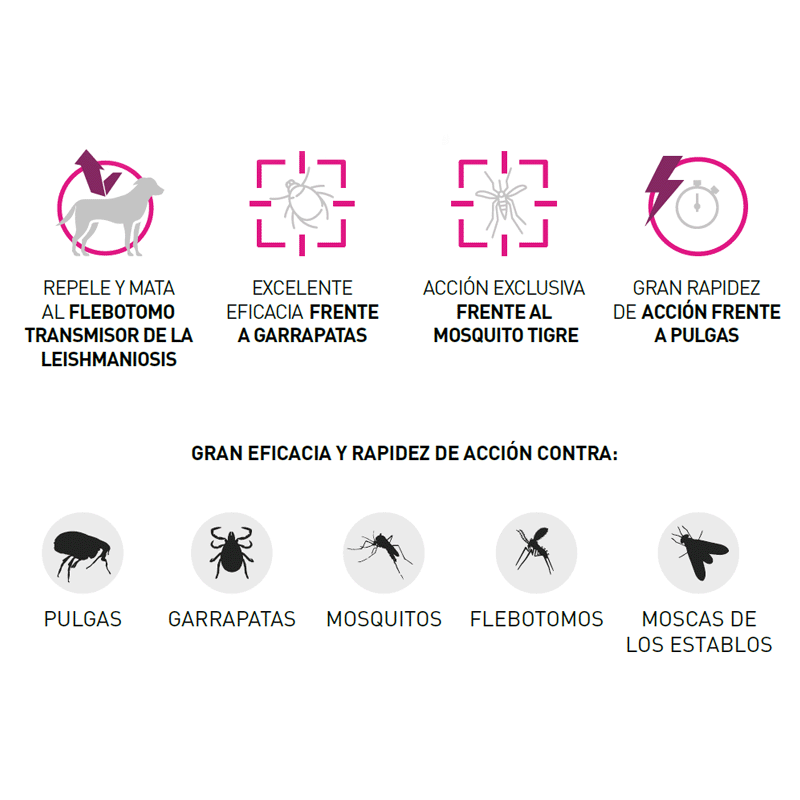 Defensa Integral contra Parásitos: Mata y repele pulgas y garrapatas, así como el mosquito transmisor de la leishmaniosis. Proporciona una acción preventiva y curativa contra una variedad de parásitos externos.