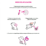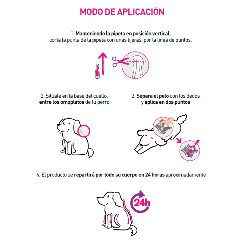 Aplica la pipeta cada 4 semanas para una protección continua. Almacena el producto a temperaturas inferiores a 30 °C en su envase original. Asegúrate de colocar la pipeta antes del baño y espera al menos 48 horas para bañar a tu animal después de la aplicación. Retira el blíster de la caja, corta la pipeta en la línea indicada y mantén el producto en posición vertical. Separa el pelaje en la línea dorsal de tu perro exponiendo la piel. Coloca la punta de la pipeta directamente sobre la piel y aplica la mitad del contenido entre la base del cráneo y los omoplatos para una aplicación efectiva.
