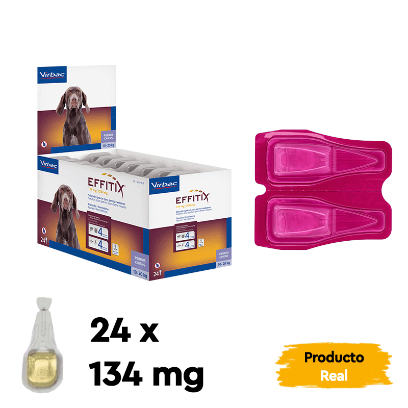 Descubre las Pipetas Effitix de Virbac diseñadas especialmente para perros medianos, con un peso de entre 10 y 20 kg. Este avanzado tratamiento proporciona una defensa completa contra garrapatas, pulgas, mosquitos y flebotomos durante cuatro semanas, gracias a su formato spot-on para una aplicación directa sobre la piel.