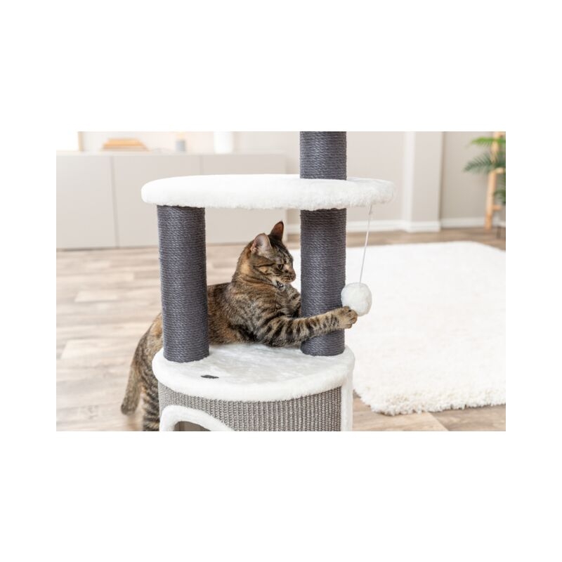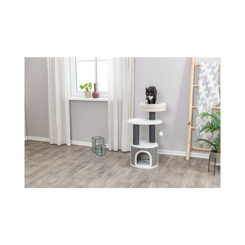 El rascador Marco está fabricado con poste revestido de yute y superficies de felpa de poliéster, materiales resistentes y agradables al tacto que fomentan el uso diario. Con su altura de 85 cm y una base de ø 38 cm, ofrece estabilidad y un punto elevado desde el que el gato puede observar su entorno con tranquilidad.