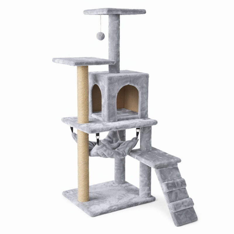Árbol rascador para gatos en color gris, con postes de sisal, cueva, hamaca, plataforma elevada y rampa, ideal para el juego, el ejercicio y el descanso diario.