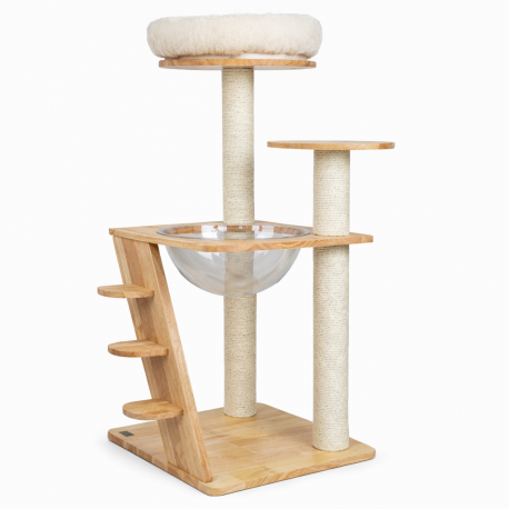 Rascador vertical para gatos de madera natural con cama elevada, plataforma, escalera y cápsula acrílica transparente, ideal para el juego, el descanso y la exploración en espacios reducidos.