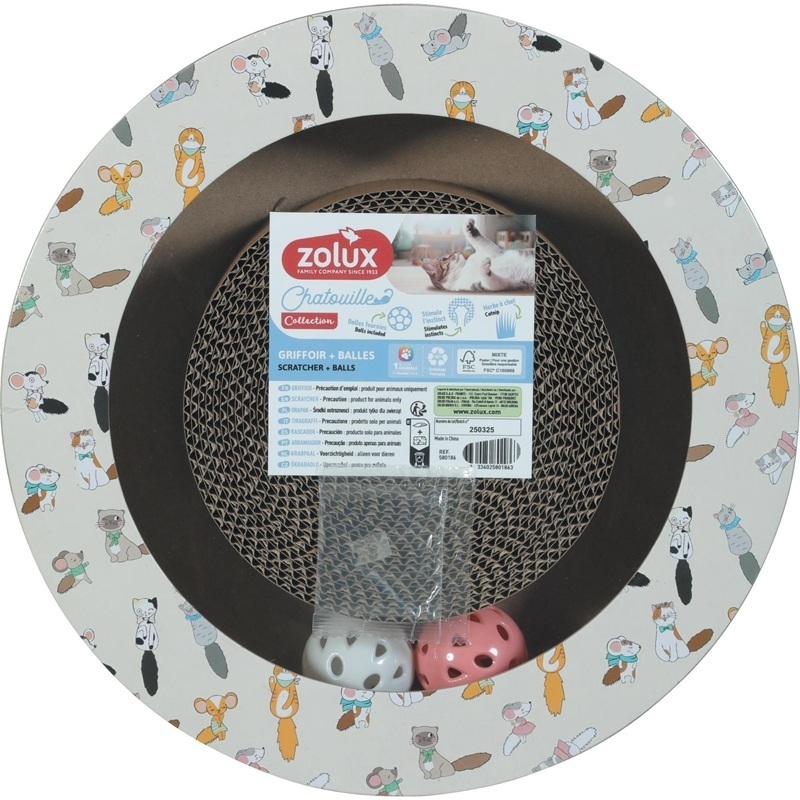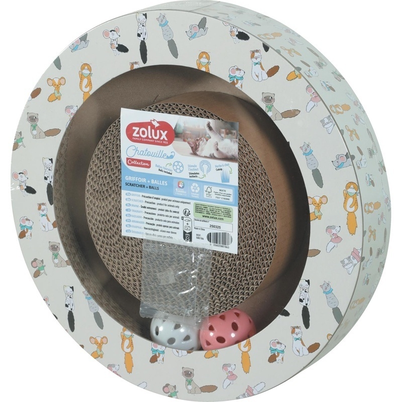 El rascador de cartón para gatos Zolux Chatouille con pelotas es una solución innovadora y compacta que combina rascado y juego interactivo en un solo producto. Su diseño redondo ofrece una amplia superficie para afilar las uñas mientras mantiene al gato entretenido gracias a sus pelotas integradas.