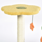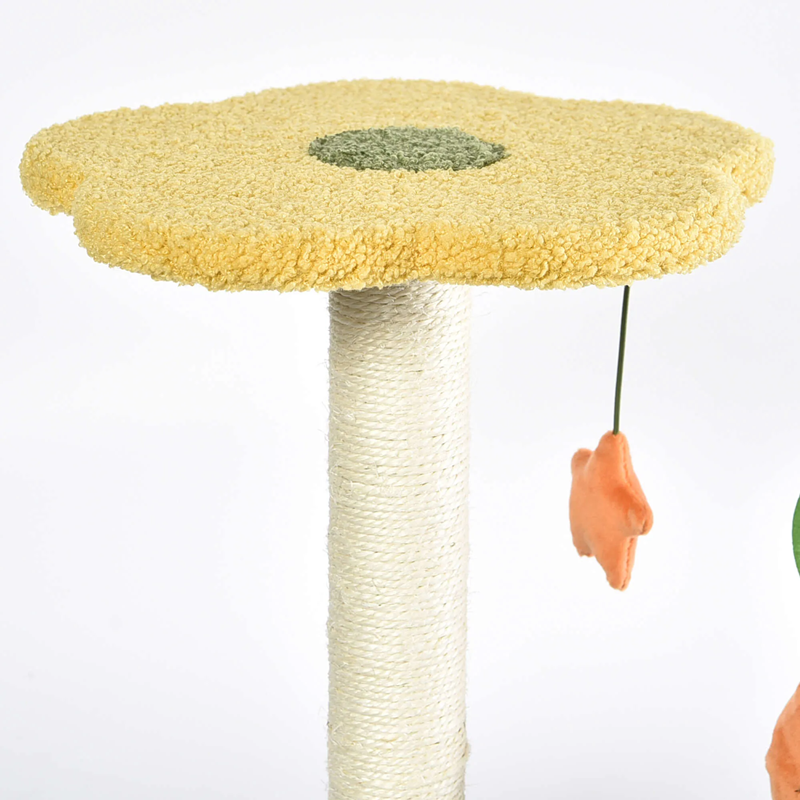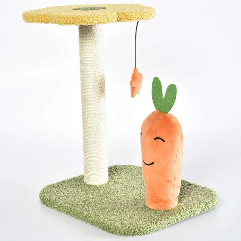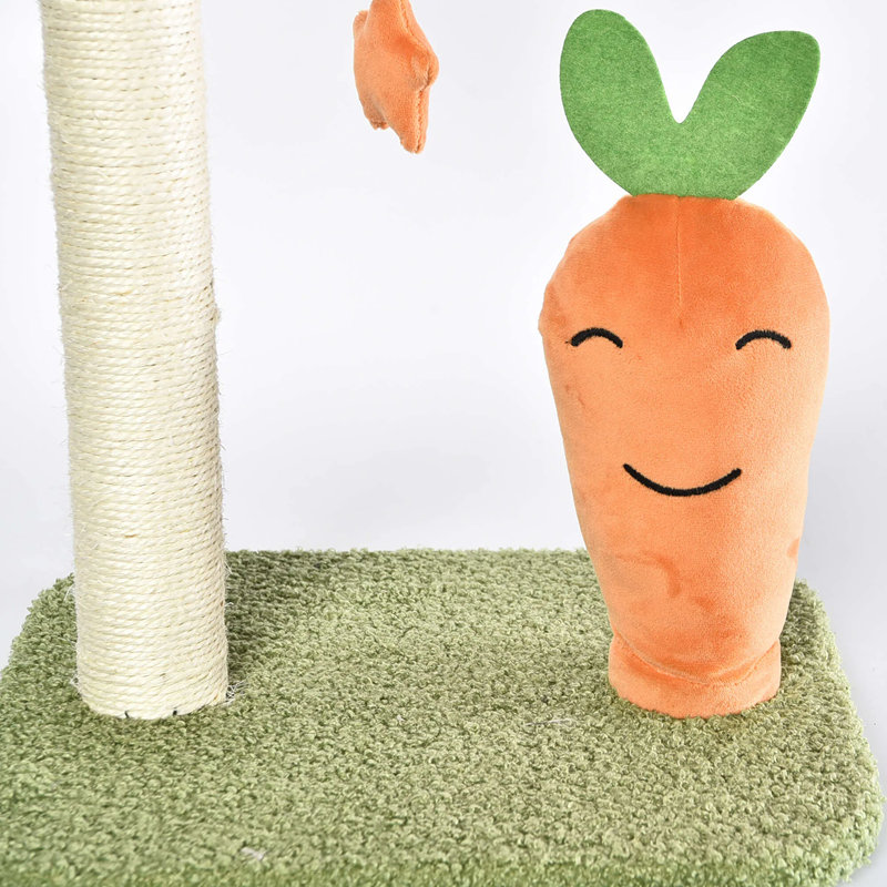 Rascador para gatos con poste de sisal, plataforma elevada, juguete colgante y diseño de zanahoria de peluche, compacto y divertido para jugar, rascar y descansar.