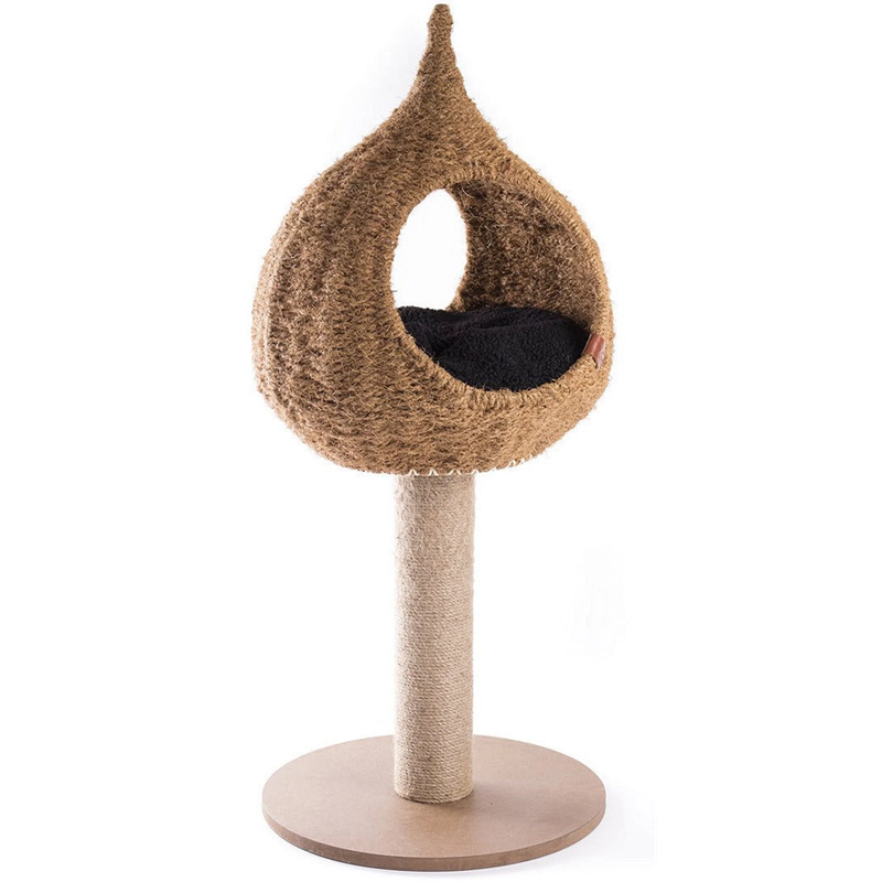 Rascador para gatos con poste de fibra de coco y cama elevada en forma de gota, ideal para rascar, estirarse y descansar con comodidad en un diseño vertical y decorativo.