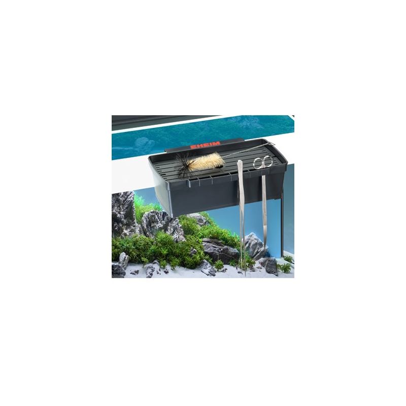 La MultiBox de EHEIM ayuda a tener siempre a mano tijeras, pinzas, redes y limpiacristales, evitando mojar el exterior y manteniendo el área de trabajo más limpia y organizada.