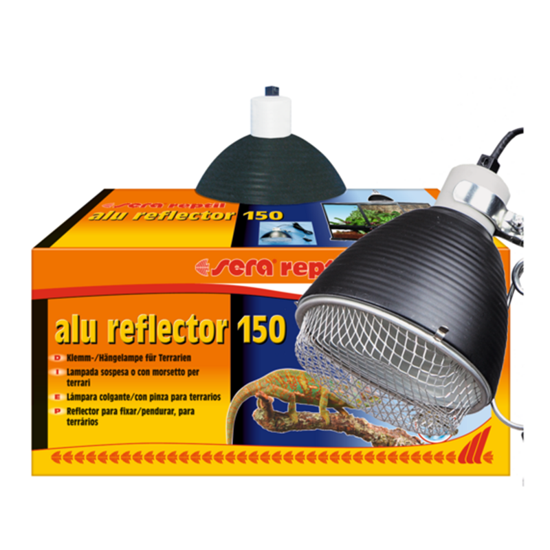 El Sera Alu Reflector 150 es una lámpara colgante creada para optimizar la iluminación y la emisión de calor en terrarios; su reflector de aluminio dirige la radiación hacia la zona deseada para crear puntos de asoleo adecuados.