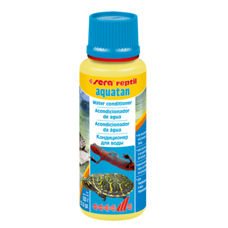 Sera Reptil Aquatan es un acondicionador para preparar al instante el agua del grifo y adaptarla a animales de terrario y acuaterrario; es especialmente útil para anfibios (ranas, salamandras) sensibles por absorción cutánea y para tortugas acuáticas, muy dependientes de una buena calidad del agua.