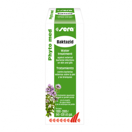 Sera Phyto Med Baktazid es un acondicionador de agua a base de plantas indicado para combatir bacterias externas que afectan a la piel, aletas y branquias de peces ornamentales en acuarios de agua dulce y estanques.