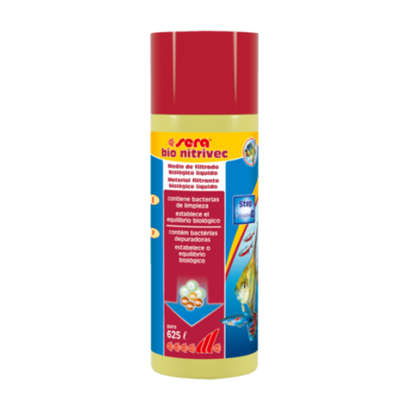 Sera Bio Nitrivec es un acondicionador biológico con millones de bacterias beneficiosas y minerales volcánicos que eliminan amonio y nitrito, restableciendo el equilibrio biológico del acuario.
