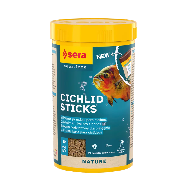 Sera Cichlids Sticks Nature es un alimento completo en sticks flotantes pensado para cíclidos omnívoros de gran tamaño, con ingredientes naturales que aseguran una dieta equilibrada y natural.