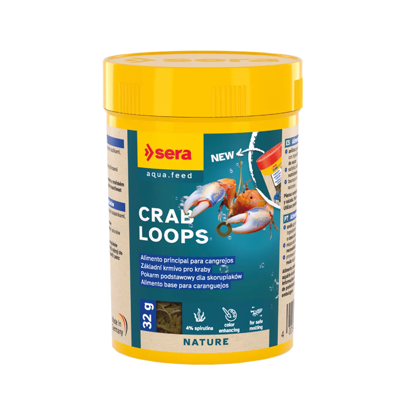 Sera Crabs Loops Nature es un alimento completo en forma de anillos hundibles que proporciona a los cangrejos una dieta natural rica en minerales, ayudando a un desarrollo saludable y a una muda estable.