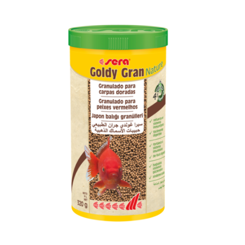 Sera Goldy Nature Estanque es un alimento granulado flotante para carpas doradas grandes y peces de agua fría, con harina de insectos Hermetia y Omega para una salud óptima en estanques.