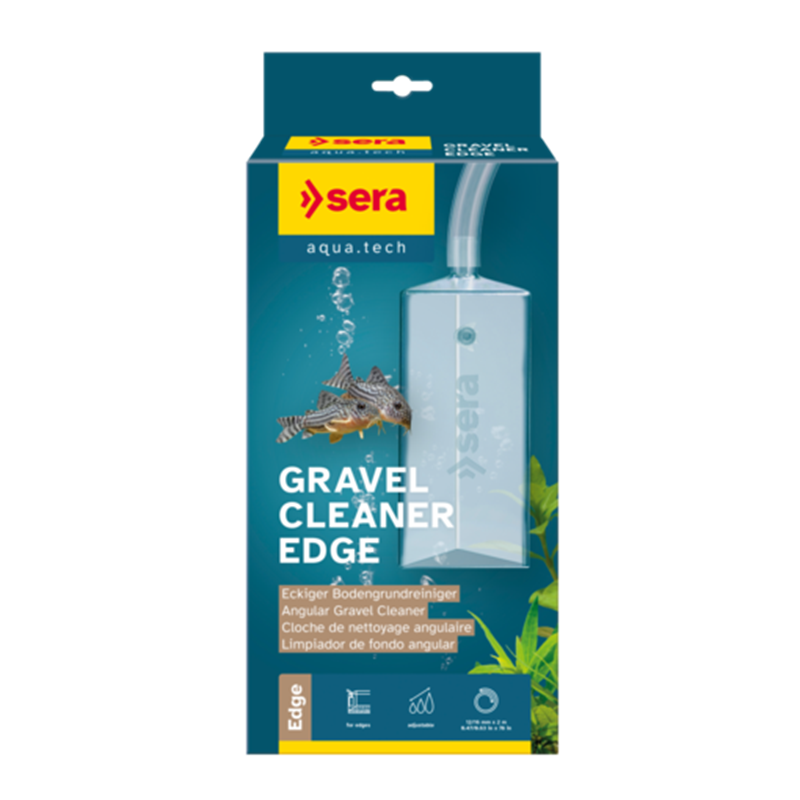 Sera Gravel Cleaner Edge está diseñado para limpiar eficazmente esquinas y bordes del acuario, donde suelen acumularse residuos.