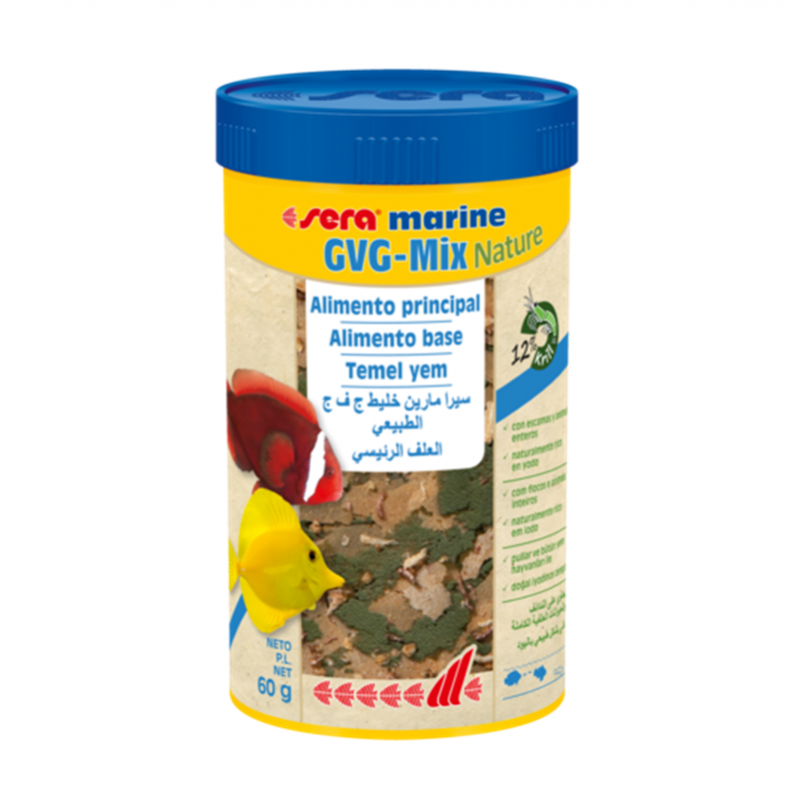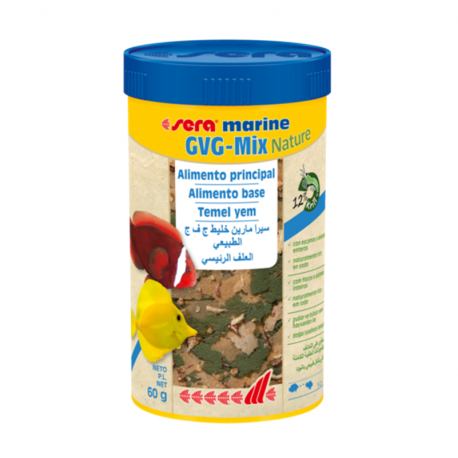 Sera Marine GVG-Mix Nature es un alimento principal en copos para peces de agua salada, elaborado con organismos marinos secos enteros como krill, dafnias y larvas de mosquito, que favorecen la vitalidad, el color y una dieta completa.