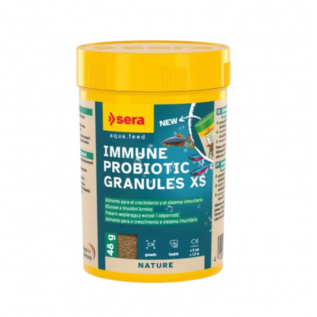 Sera Immune Probiotic Granules XS es un alimento completo probiótico en granulado fino para peces ornamentales de hasta 5 cm, que favorece un crecimiento equilibrado, refuerza las defensas y mejora la digestión desde etapas tempranas.