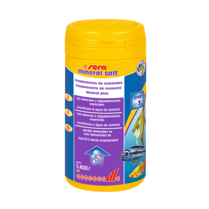Sera Mineral Salt aporta minerales clave como calcio, magnesio y potasio para peces, plantas e invertebrados, evitando carencias en acuarios con agua blanda u osmotizada.