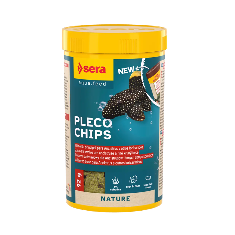 Sera Pleco Chips Nature es un alimento completo en chips de hundimiento rápido para Ancistrus y loricáridos raspadores, formulado con ingredientes naturales que respetan su forma de alimentación y mejoran la digestión.