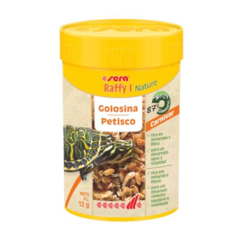 Sera Raffy I Nature es un alimento complementario pensado para aportar variedad a la dieta de tortugas acuáticas y otros reptiles carnívoros, utilizando ingredientes animales seleccionados que imitan su alimentación natural.