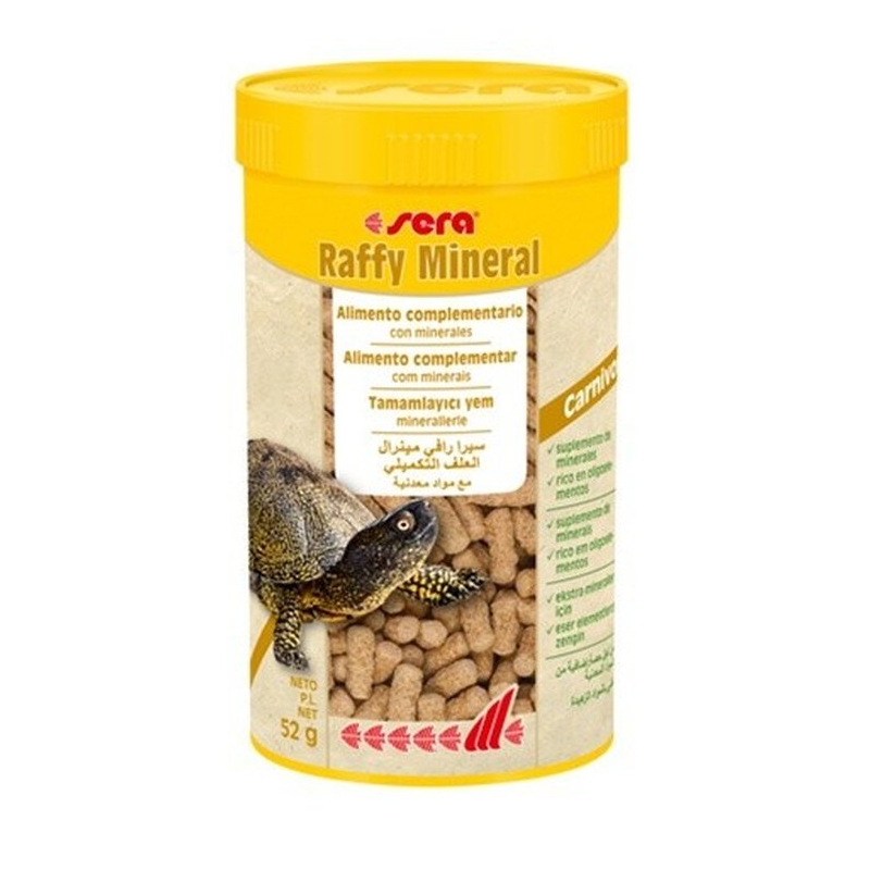Sera Raffy Mineral es un alimento complementario en forma de gránulos para reptiles carnívoros, como tortugas acuáticas. Aporta minerales esenciales que ayudan al mantenimiento de huesos y caparazón, además de apoyar las defensas.