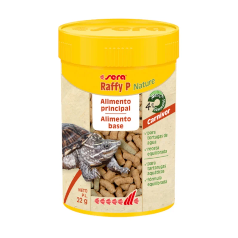 Sera Raffy P Nature es un alimento completo en granulado flotante para tortugas acuáticas y otros reptiles carnívoros, con ingredientes animales y vegetales seleccionados para una dieta equilibrada, sabrosa y sencilla de administrar.