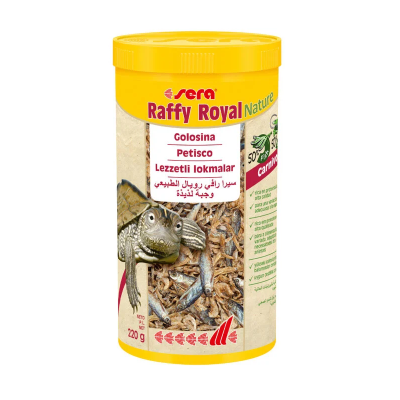 Sera Raffy Royal Nature es un snack natural muy proteico elaborado a partir de peces y gambas deshidratados, indicado como premio ocasional para reptiles, tortugas acuáticas, anfibios y grandes peces depredadores. Aporta omega, minerales y oligoelementos que ayudan a mantener la energía y el crecimiento.