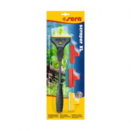 Sera Scraper XL es un limpiacristales para acuarios con cuchilla de acero inoxidable y cabezal giratorio, perfecto para retirar algas y suciedad con precisión y mantener el acuario impecable.