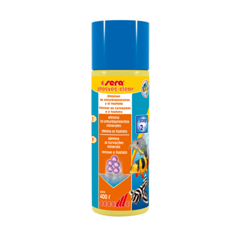 Sera Phosvec Clear elimina rápidamente la turbidez del agua y reduce el exceso de fosfatos, ayudando a mantener un acuario transparente y sin algas.