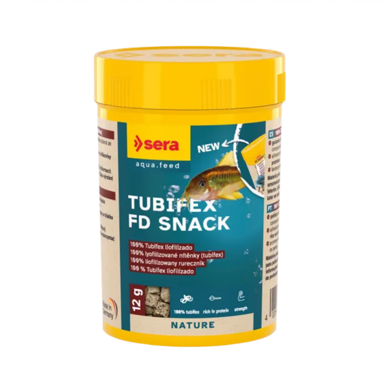 Sera Tubifex FD Snack es una golosina natural rica en proteínas, elaborada exclusivamente con Tubifex liofilizado, ideal para aumentar la energía y estimular la vitalidad de los peces.