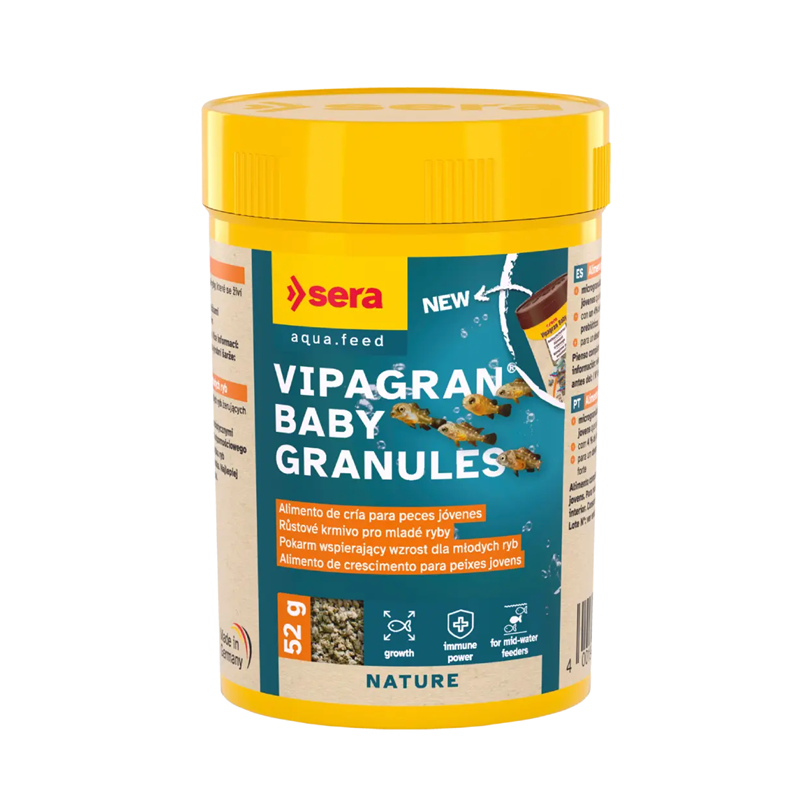 Sera Vipagran Baby Nature es un alimento completo en microgranulado blando de hundimiento lento para peces ornamentales jóvenes de zonas medias.