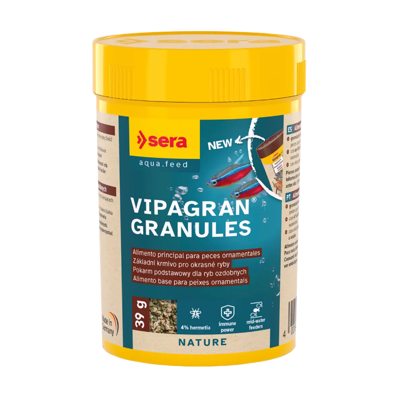 Sera Vipagran Nature es un alimento granulado blando de hundimiento lento que proporciona una nutrición natural, completa y muy digestible a peces ornamentales de zonas medias, ayudando a mantener el agua limpia.