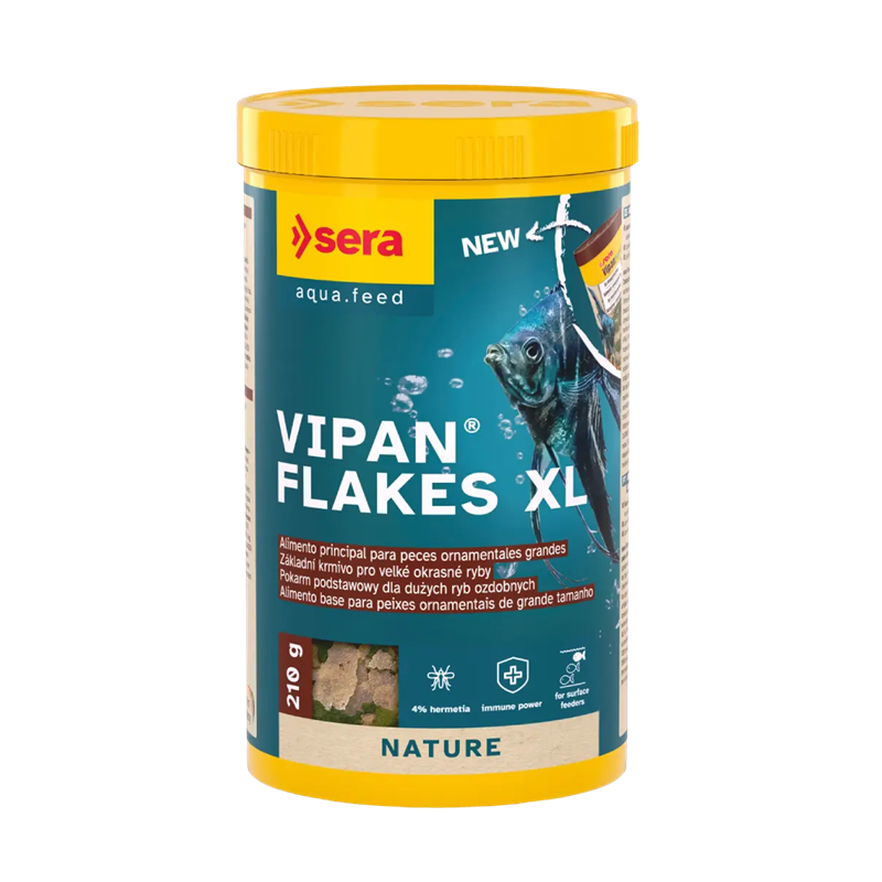Sera Vipan Flakes XL es un alimento principal en escamas de gran tamaño especialmente diseñado para peces ornamentales grandes que se alimentan en la superficie, elaborado con ingredientes naturales de la gama Nature.