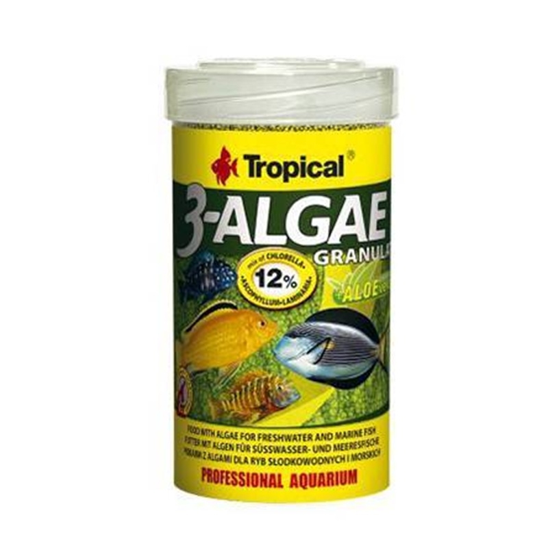 Tropical 3-Algae Granulat es un alimento en granulado de hundimiento lento, formulado para la dieta diaria de peces herbívoros de agua dulce y salada. También puede usarse como suplemento en peces omnívoros.