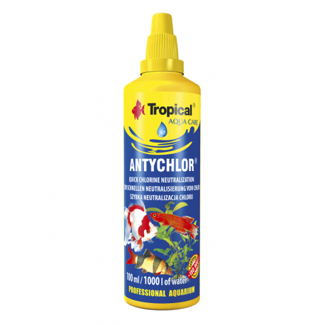 Tropical Antychlor, de la línea Tropical Aqua Care, está pensado para tratar agua del grifo destinada al acuario, ya que suele contener cloro o compuestos clorados perjudiciales para peces y plantas.