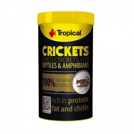 Tropical Crickets es un alimento complementario natural hecho con grillos secos (Acheta domesticus), pensado para reptiles y anfibios. Es una alternativa práctica para imitar la dieta basada en insectos que estos animales consumirían de forma natural.
