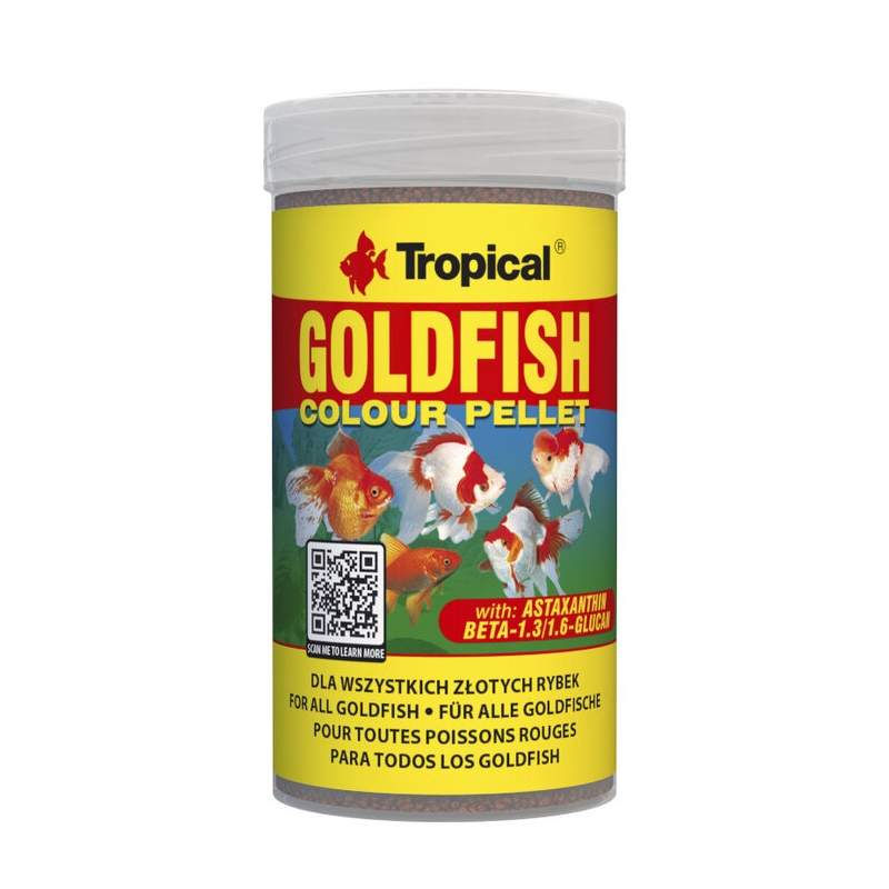 Tropical Goldfish Color Pellet es un alimento completo en pellets flotantes para goldfish y kois jóvenes, con astaxantina, beta-glucanos y vitamina C.