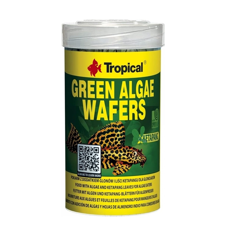 Tropical Green Algae Wafers es un alimento básico en wafers para especies que necesitan un alto aporte de ingredientes vegetales y algas. Está especialmente indicado para Loricariidae (plecos, Plecostomus) y otros peces de fondo, además de crustáceos de agua dulce y marina.