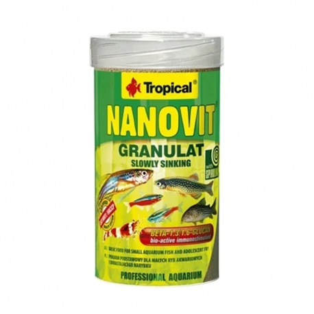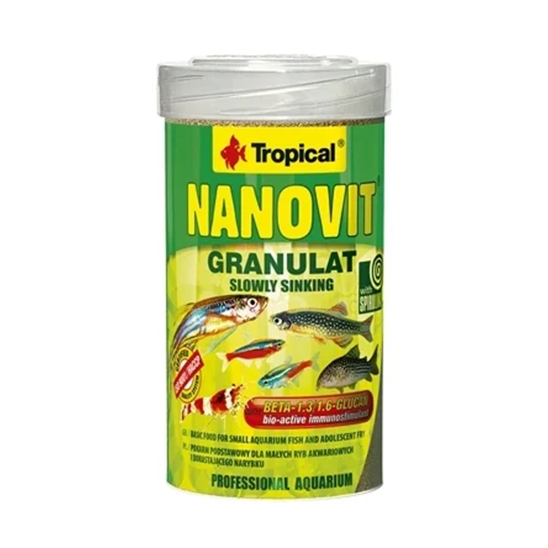 Tropical Nanovit Granulat es un alimento diario en microgránulos de hundimiento lento, desarrollado para peces pequeños y peces en crecimiento. Su tamaño facilita la ingesta en especies como tetras pequeños, rasboras, corydoras enanos y alevines que necesitan nutrientes completos en cada toma.