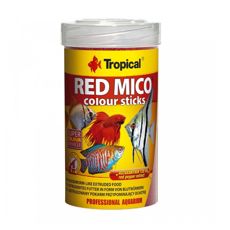 Tropical Red Mico Colour Stick es un alimento completo en sticks flotantes para peces omnívoros y carnívoros de agua dulce, salobre o marina. Su forma alargada recuerda a los gusanos de sangre y, al desplazarse con la corriente, despierta el instinto de caza y mejora la aceptación.
