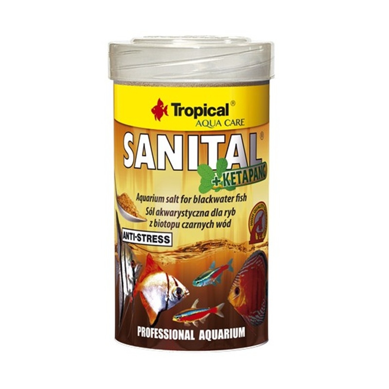 Tropical Sanital Plus con Ketapang es una sal acuarística con extractos de Ketapang (Terminalia catappa) y corteza de roble, diseñada para acondicionar el agua y recrear un entorno similar al de peces de aguas negras (discos, escalares, tetras neón) y también para peces salobres.