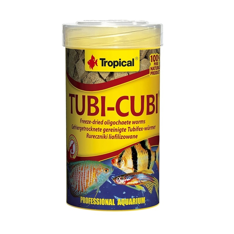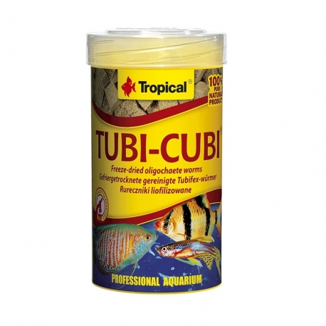 Tubifex liofilizado en prácticos dados concentrados es un alimento natural muy proteico indicado para peces carnívoros y omnívoros, así como para tortugas acuáticas.