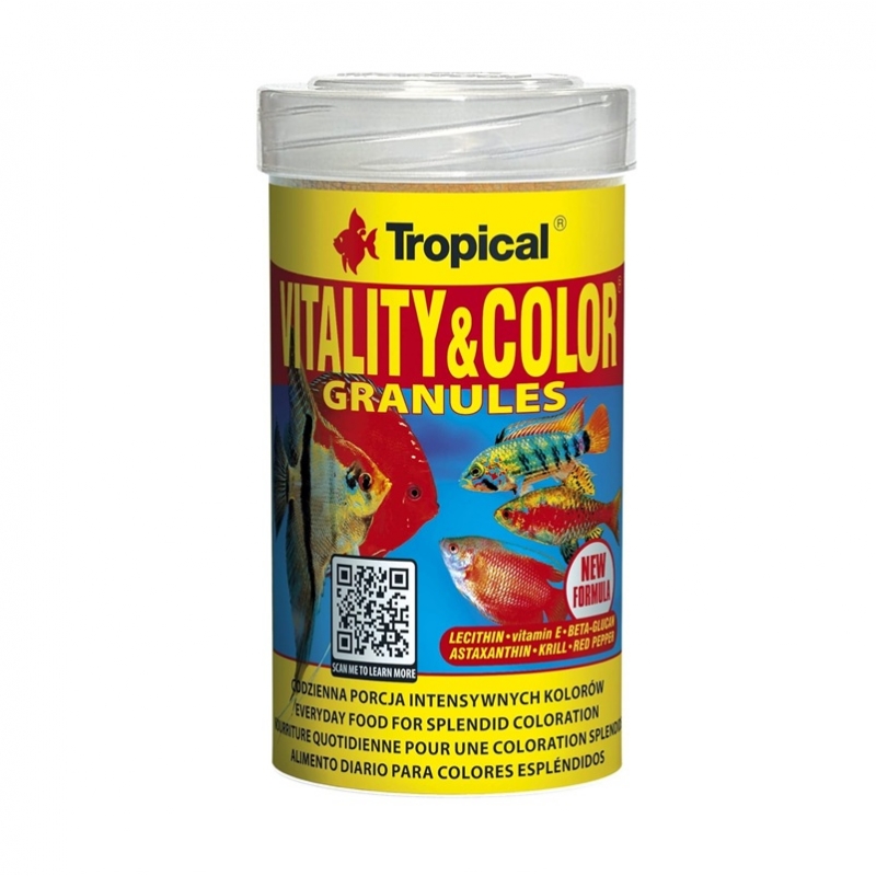 Tropical Vitality & Color Granulat es un alimento granulado alto en proteínas para peces carnívoros y omnívoros, con astaxantina y betacaroteno para intensificar la coloración.