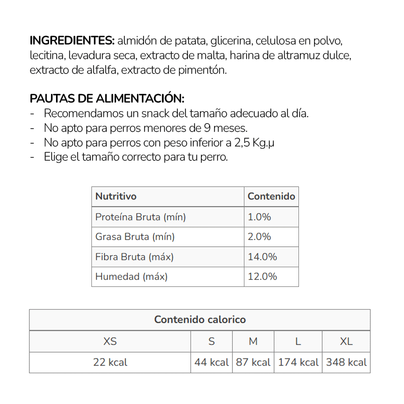 FÉCULA DE PATATA, GLICERINA, CELULOSA EN POLVO, LECITINA, LEVADURA SECA, EXTRACTO DE MALTA, HARINA DE ALTRAMUZ DULCE, EXTRACTO DE ALFALFA, EXTRACTO DE PIMENTÓN