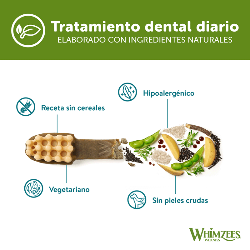 Los snacks dentales WHIMZEES en forma de cepillo de dientes ofrecen una combinación perfecta de cuidado dental y placer de masticar para su perro gigante (de más de 27 kg). Sus diseños únicos y su textura basada en vegetales no solo promueven la limpieza dental, sino que también contribuyen al flujo sanguíneo entre las encías, previniendo el mal aliento y la acumulación de placa y sarro dental.
