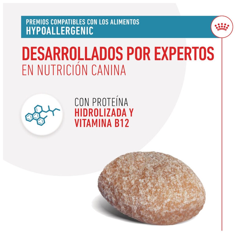 Snack hipoalergénico para perros adultos con intolerancias, hecho con proteína hidrolizada y vitamina B12 para reducir reacciones adversas y ofrecer un premio seguro sin alterar la alimentación especial.