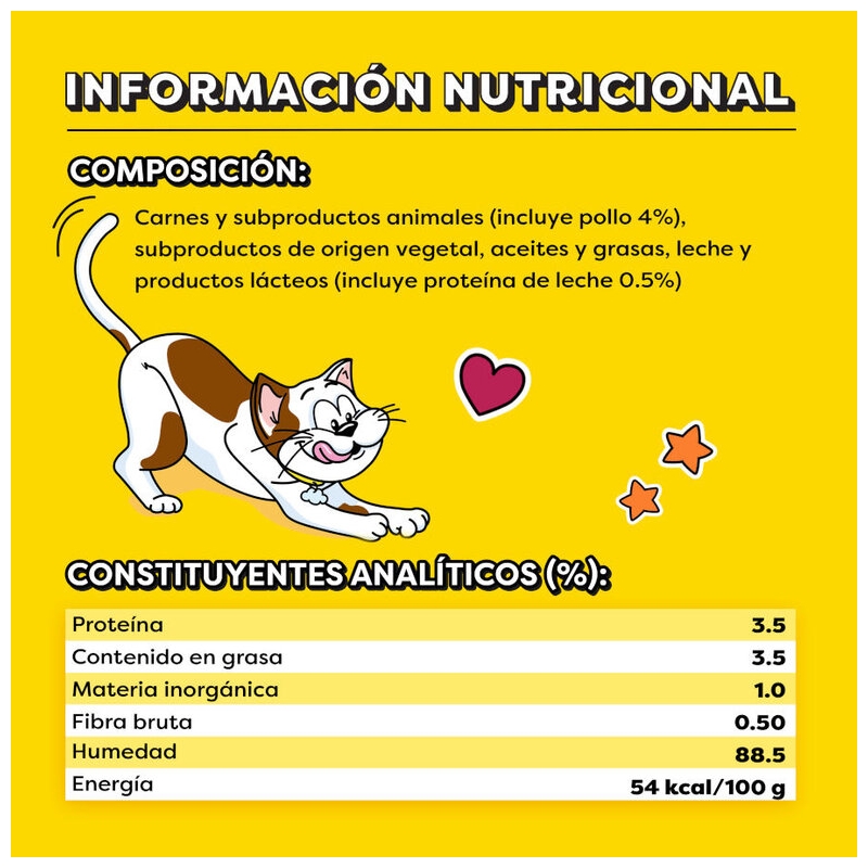 Su textura suave y su sabor intenso a pollo convierten cada toma en un momento irresistible. Además, su contenido en humedad ayuda a mejorar la hidratación y digestión diaria de tu gato.