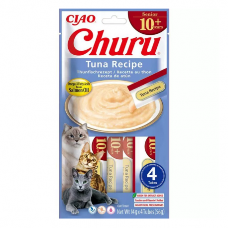 Churu Cat Senior Receta de Atún es un snack funcional desarrollado específicamente para gatos mayores de 10 años. Elaborado con atún real de alta calidad, ofrece proteínas fácilmente digeribles y un sabor muy atractivo para gatos con poco apetito o dificultad al masticar.
